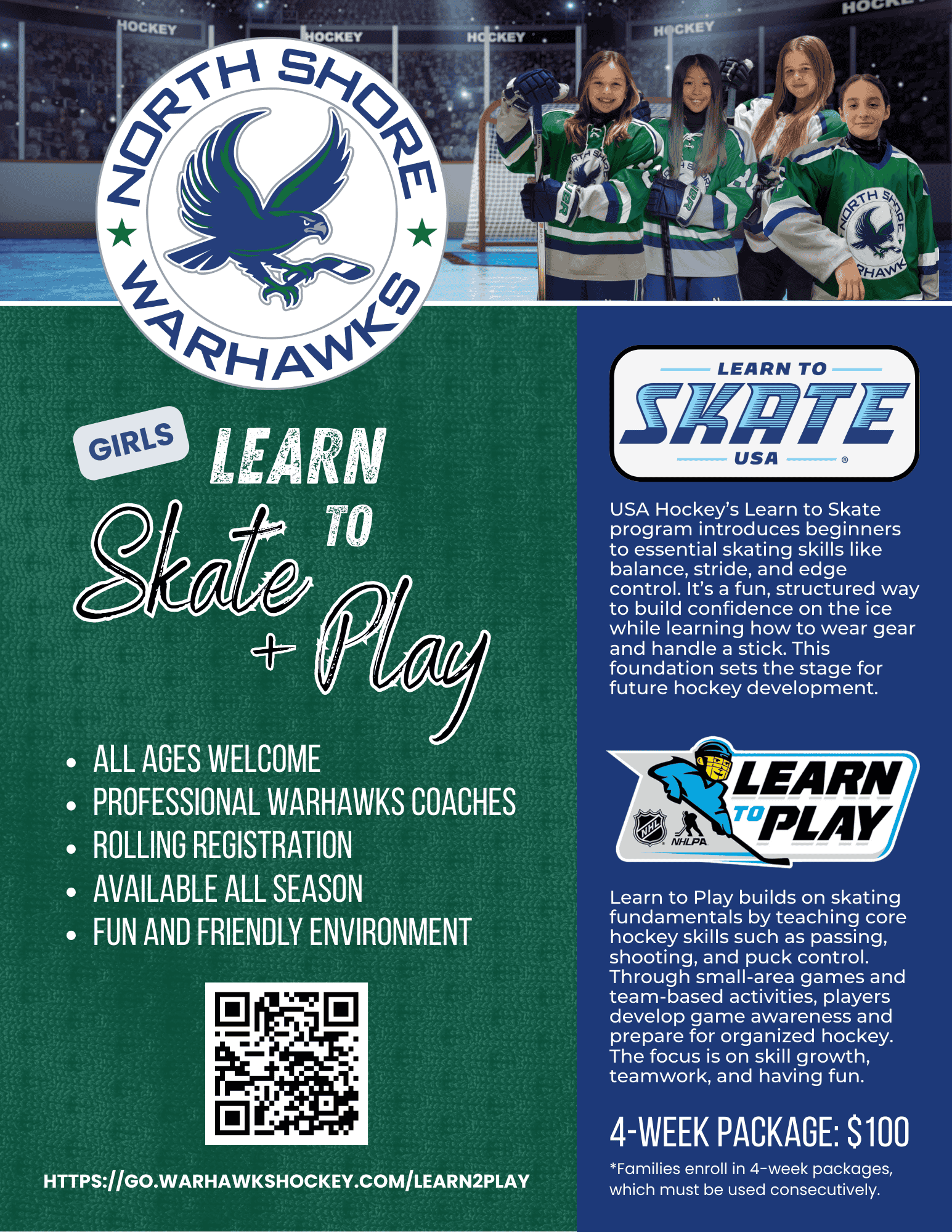 The Warhawks have partnered with Rink Rat Rentals who offer high-quality rental equipment for youth hockey players aged 3-12, providing an affordable alternative to buying new gear. This partnership ensures that families have access to all the gear they need, whether your child is a first-year skater or already a few seasons in.
