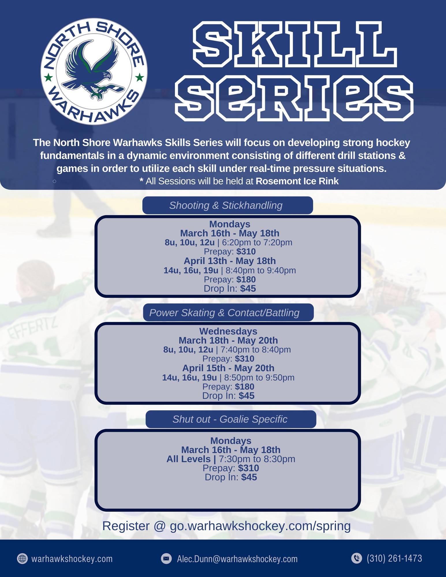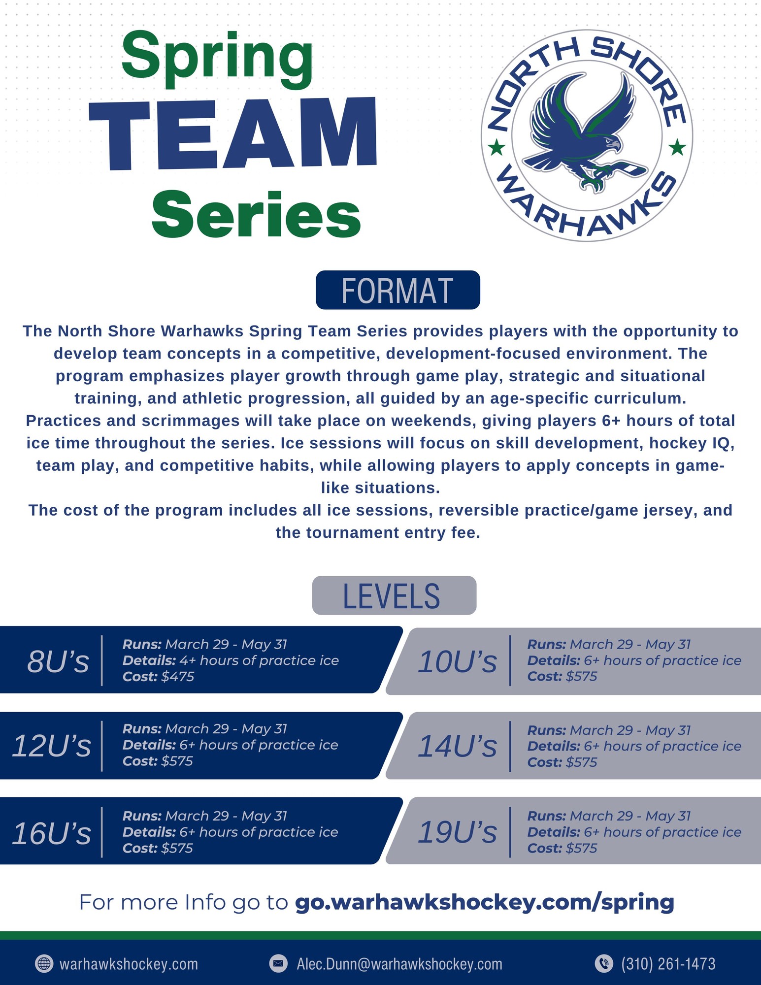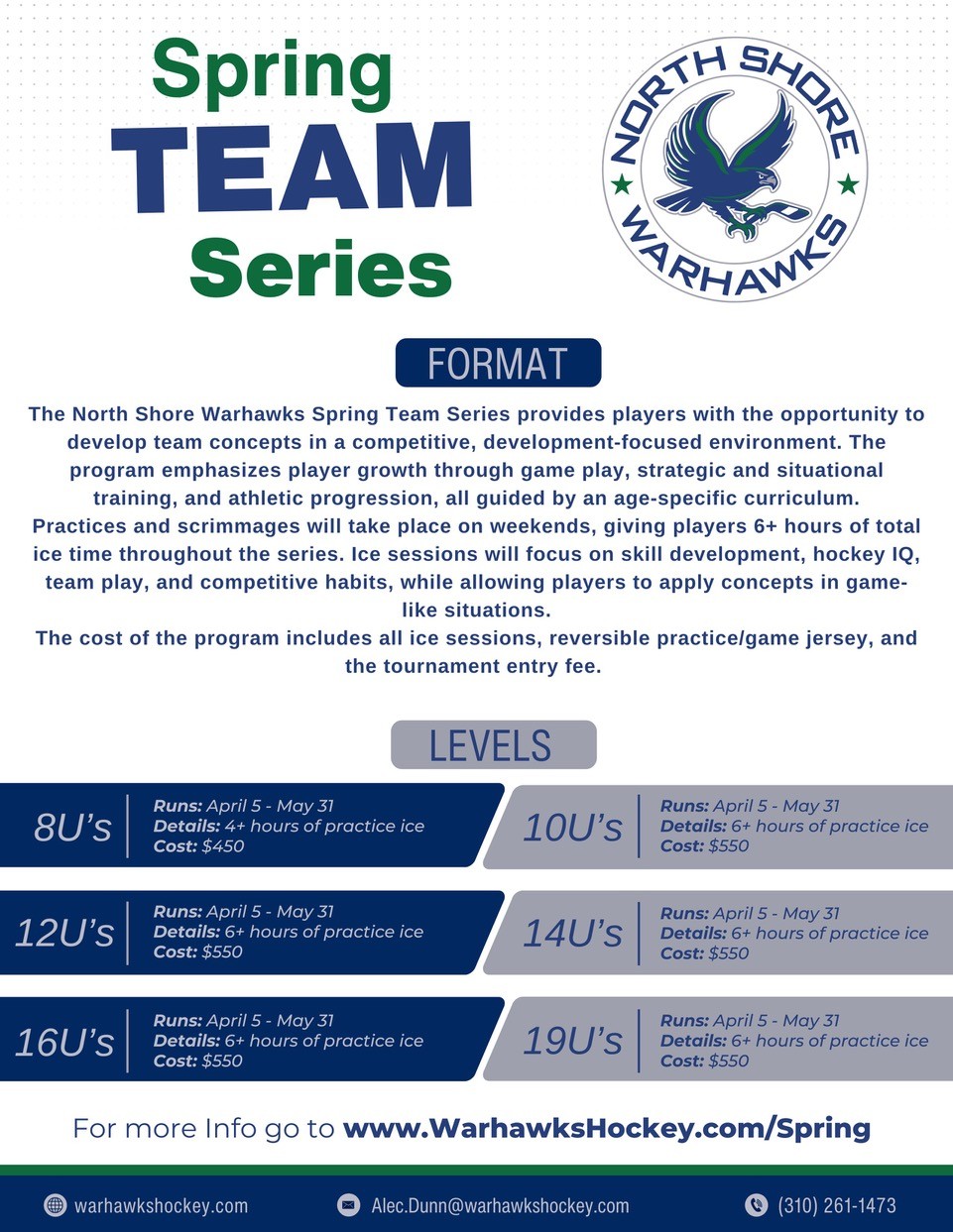 The North Shore Warhawks Spring Team Series provides players with the opportunity to develop team concepts in a competitive, development-focused environment. The program emphasizes player growth through game play, strategic and situational training, and athletic progression, all guided by an age-specific curriculum. Practices and scrimmages will take place on weekends, giving players 6+ hours of total ice time throughout the series. Ice sessions will focus on skill development, hockey IQ, team play, and competitive habits, while allowing players to apply concepts in game-like situations.