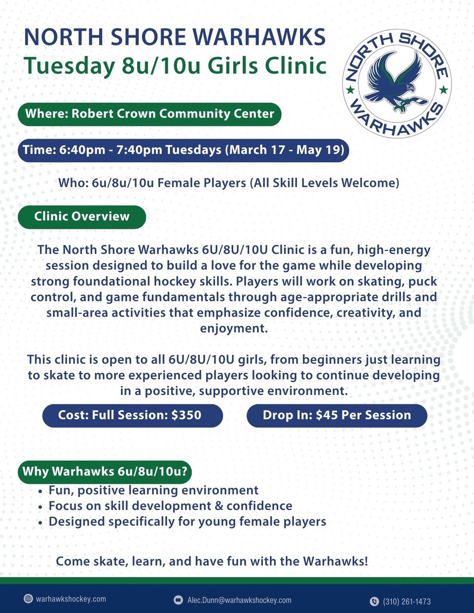 The North Shore Warhawks 6U/8U/10U Clinic is a fun, high-energy session designed to build a love for the game while developing strong foundational hockey skills. Players will work on skating, puck control, and game fundamentals through age-appropriate drills and small-area activities that emphasize confidence, creativity, and enjoyment.