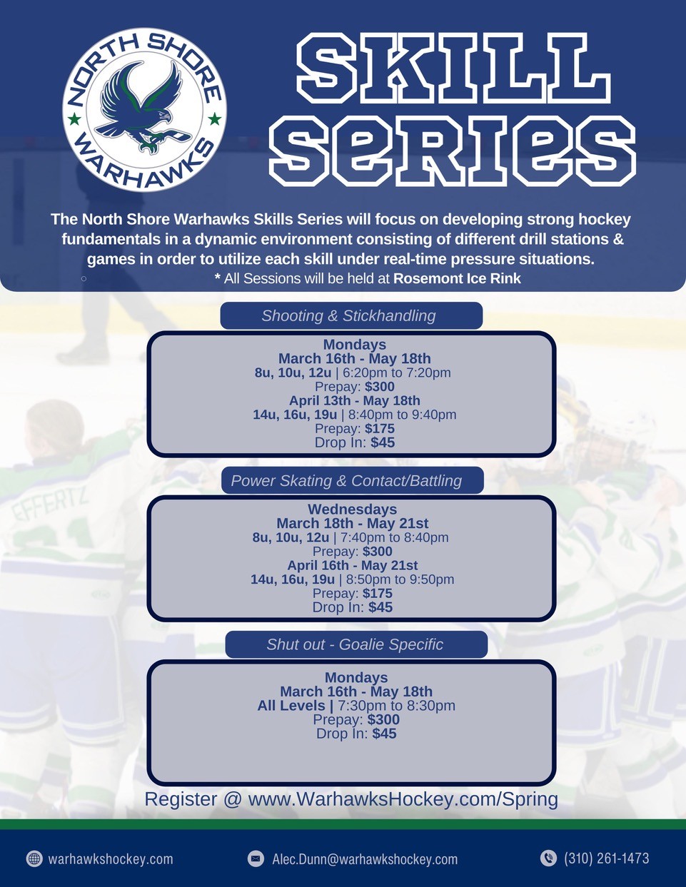 The North Shore Warhawks Spring Skills Series will focus on developing strong hockey fundamentals in a dynamic environment consisting of different drill stations & games in order to utilize each skill under real-time pressure situations.